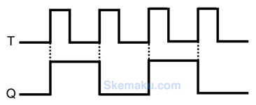 output Q yang sebelumnya 1 akan berubah ke kondisi 0 jika input T mendapatkan